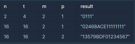 ์ด๋ ๊ฒ ๊ฒ์์ ์งํํ ๊ฒฝ์ฐ, ํํธ ์ฝ๋ฉ ๋์๋ฆฌ ์ผ์๋ค์ ์ปดํจํฐ๋ฅผ ๋ค๋ฃจ๋ ์ฌ๋๋ต๊ฒ ์ด์ง์๋ก ์ด ๊ฒ์์ ์งํํ๊ธฐ๋ ํ๋๋ฐ, ์ด ๊ฒฝ์ฐ์๋ ์ด์ง์๋ก ์งํํ๋ ๊ฒ์์ ์ต์ํด์ ธ ์ง๋ ค๊ฐ๋ ์ฌ๋๋ค์ ์ข ๋ ๋์ด๋๋ฅผ ๋์ด๊ธฐ ์ํด ์ด์ง๋ฒ์์ ์ญ์ก์ง๋ฒ๊น์ง ๋ชจ๋ ์ง๋ฒ์ผ๋ก ๊ฒ์์ ์งํํด๋ณด๊ธฐ๋ก ํ๋ค. ์ซ์ ๊ฒ์์ด ์ต์ํ์ง ์์ ํ๋ธ๋ ๊ฒ์์ ์ ธ์ ๋ฒ์น์ ๋ฐ๋ ๊ตด์์ ํผํ๊ธฐ ์ํด, ์์ ์ด ๋งํด์ผ ํ๋ ์ซ์๋ฅผ ์ค๋งํธํฐ์ ๋ฏธ๋ฆฌ ์ถ๋ ฅํด์ฃผ๋ ํ๋ก๊ทธ๋จ์ ๋ง๋ค๋ ค๊ณ ํ๋ค. ํ๋ธ์ ํ๋ก๊ทธ๋จ์ ๊ตฌํํ๋ผ. ์ ๋ ฅ ํ์์ง๋ฒ n, ๋ฏธ๋ฆฌ ๊ตฌํ ์ซ์์ ๊ฐฏ์ t, ๊ฒ์์ ์ฐธ๊ฐํ๋ ์ธ์ m, ํ๋ธ์ ์์ p ๊ฐ ์ฃผ์ด์ง๋ค.