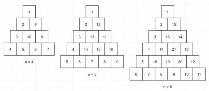 ์ ์ n์ด ๋งค๊ฐ๋ณ์๋ก ์ฃผ์ด์ง๋๋ค. ๋ค์ ๊ทธ๋ฆผ๊ณผ ๊ฐ์ด ๋ฐ๋ณ์ ๊ธธ์ด์ ๋์ด๊ฐ n์ธ ์ผ๊ฐํ์์ ๋งจ ์ ๊ผญ์ง์ ๋ถํฐ ๋ฐ์๊ณ ๋ฐฉํฅ์ผ๋ก ๋ฌํฝ์ด ์ฑ์ฐ๊ธฐ๋ฅผ ์งํํ ํ, ์ฒซ ํ๋ถํฐ ๋ง์ง๋ง ํ๊น์ง ๋ชจ๋ ์์๋๋ก ํฉ์น ์๋ก์ด ๋ฐฐ์ด์ return ํ๋๋ก solution ํจ์๋ฅผ ์์ฑํด์ฃผ์ธ์.