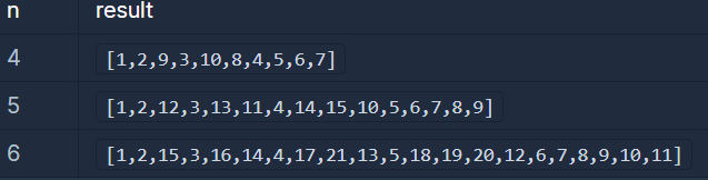 5 [1,2,12,3,13,11,4,14,15,10,5,6,7,8,9] 6 [1,2,15,3,16,14,4,17,21,13,5,18,19,20,12,6,7,8,9,10,11]