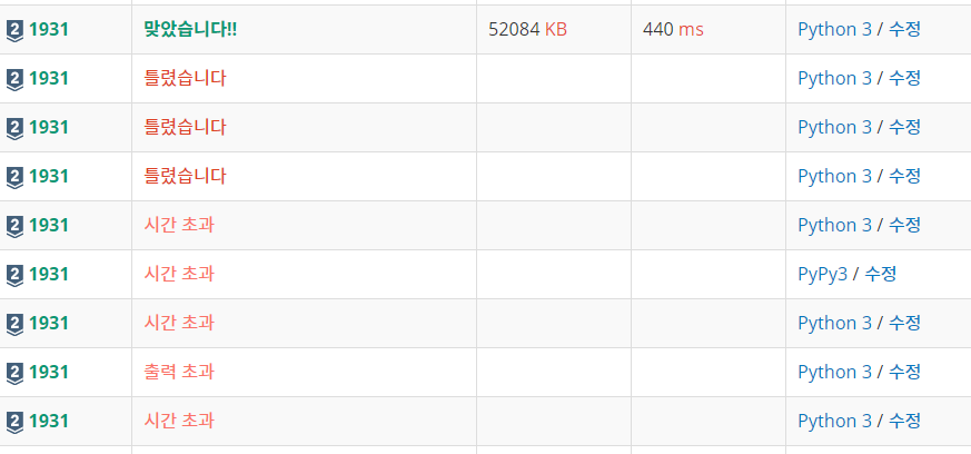 💬 처음 구현한 코드에서는 정렬 기준을 시작 시간으로, 또 이중 포문으로 모든 회의의 가능 여부를 모두 확인했기 때문에 시간 초과가 났다. (시간 초과가 나시는 분들은 이 두 가지를 확인하시면 좋을 것 같습니다.)