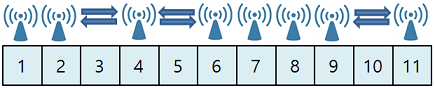 ์๋ฅผ ๋ค์ด 11๊ฐ์ ์ํํธ๊ฐ ์ญ ๋์ด์ ์๊ณ , [4, 11] ๋ฒ์งธ ์ํํธ ์ฅ์์๋ 4g ๊ธฐ์ง๊ตญ์ด ์ค์น๋์ด ์์ต๋๋ค. ๋ง์ฝ ์ด 4g ๊ธฐ์ง๊ตญ์ด ์ ํ ๋๋ฌ ๊ฑฐ๋ฆฌ๊ฐ 1์ธ 5g ๊ธฐ์ง๊ตญ์ผ๋ก ๋ฐ๋ ๊ฒฝ์ฐ ๋ชจ๋ ์ํํธ์ ์ ํ๋ฅผ ์ ๋ฌํ ์ ์์ต๋๋ค. (์ ํ์ ๋๋ฌ ๊ฑฐ๋ฆฌ๊ฐ W์ผ ๋, ๊ธฐ์ง๊ตญ์ด ์ค์น๋ ์ํํธ๋ฅผ ๊ธฐ์ค์ผ๋ก ์ ํ๋ฅผ ์์ชฝ์ผ๋ก W๋งํผ ์ ๋ฌํ ์ ์์ต๋๋ค.)