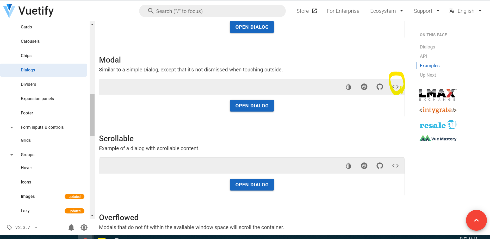 Vuetify 홈페이지에 들어가서 사용하고 싶은 컴포넌트를 선택한다.