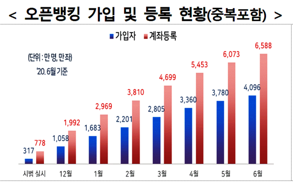 ์คํ๋ฑ ํน(Open Banking) ์๋น์ค๊ฐ ์ ๋ฉด ์ํ๋ ์ง 6๊ฐ์ ๋ง์ ๊ฐ์ ์๊ฐ 4,000๋ง ๋ช ์ ๋์ด์ฐ๋ค. ๋ฑ๋ก๊ณ์ข์๋ 6,600๋ง ์ข๋ก, ์ถ์ ์ดํ ๊พธ์คํ ์ฆ๊ฐ์ธ๋ฅผ ํ๊ณ ์๋ค. ์ค๋ณต์ ์ ์ธํ ๊ฐ์ ์ ์๋ 2,032๋ง ๋ช ์ผ๋ก, ๊ตญ๋ด ๊ฒฝ์ ํ๋์ธ๊ตฌ 10๋ช ์ค 7๋ช ์ ์คํ๋ฑ ํน ์๋น์ค๋ฅผ ์ด์ฉ ์ค์ด๋ค. ์ผ๊ฐ์์ ์ 1 ๊ธ์ต๊ถ์ ์ค์ฌ์ผ๋ก ์ฑ๊ณผ๊ฐ ๋ํ๋๊ธฐ ์์ํ๋ค๋ฉฐ ์ง๊ธ๊น์ง๋ ‘์ํญ’์ผ๋ก ํ๊ฐํ๊ณ ์๋ค. ๋น๊ตญ์ ์ค๋ 12์๋ถํฐ ์ 2๊ธ์ต๊ถ๋ ์คํ๋ฑ ํน ์๋น์ค์ ์ฐธ์ฌ์ํค๋ ๋ฑ ์ด๋ฅธ๋ฐ ‘์ธํํธ ๊ธ์ต’ ์๋๋ฅผ ๋์ฑ ์๋น๊ธฐ๊ฒ ๋ค๋ ๊ณํ์ด๋ค.