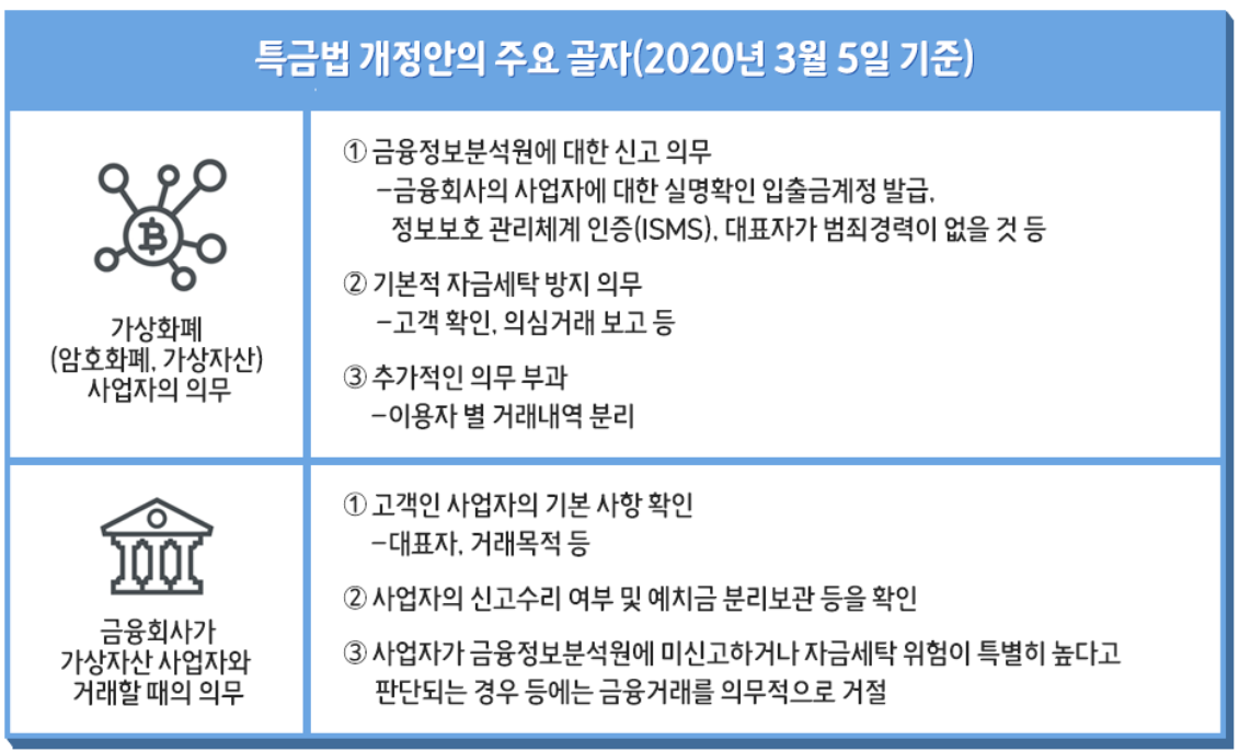 ๋จผ์ ๋ธ๋ก์ฒด์ธ์ ํ์ฑํ์ ์ํฅ์ ์ฃผ๋ ํน๊ธ๋ฒ์ ๋ํด ์์๋ณด๊ฒ ๋ค. ์ง๋ 3์ 5์ผ ‘ํน์ ๊ธ์ต๊ฑฐ๋์ ๋ณด์ ๋ณด๊ณ ๋ฐ ์ด์ฉ ๋ฑ์ ๊ดํ ๋ฒ๋ฅ ’(์ดํ ํน๊ธ๋ฒ)์ด ํต๊ณผ๋์๋ค. ํด๋น ๋ฒ์์ G20, ์๊ธ์ธํ๋ฐฉ์ง๊ธฐ๊ตฌ ๋ฑ ๊ตญ์ ๊ธฐ๊ตฌ๋ค์ ์๊ธ ์ธํ ๋ฐฉ์ง๋ฅผ ์ํ ๊ตญ์ ๊ธฐ์ค์ ํ ๋๋ก ๊ตญ๋ด ํ์ค์ ๋ง๊ฒ ์ ์ ํ ์ ๋์ ์ฅ์น์ด๋ค.